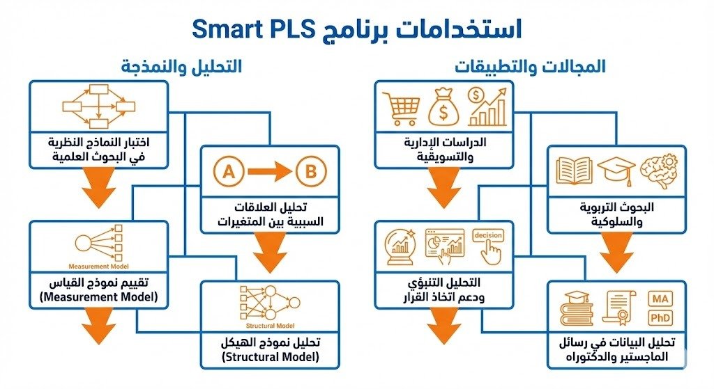 يستخدم برنامج (SmartPLS) على نطاق واسع في البحوث الأكاديمية والتطبيقية؛ لتحليل نماذج المعادلات الهيكلية باستخدام منهجية PLS-SEM؛ حيث يمكن للمحلل اختبار العلاقات السببية المعقدة بين المتغيرات الكامنة والظاهرة بطريقة مرنة ودقيقة، وتبرز أهمية البرنامج في الدراسات التي تسعى إلى تفسير الظواهر والتنبؤ بها في آنٍ واحد، وخاصة عندما تكون البيانات غير موزعة طبيعيًا أو عندما يكون حجم العينة محدودًا، أبرز استخدامات تحليل SmartPLS: