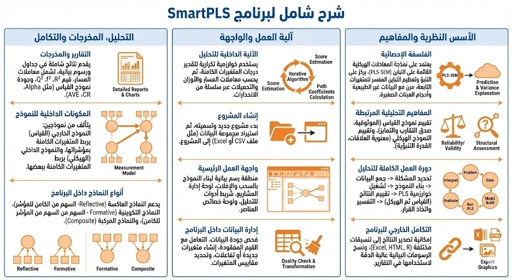 يعد تحليل SmartPLS بيئة تحليل متكاملة متخصصة في نمذجة المعادلات الهيكلية وفق منهجية المربعات الصغرى الجزئية (PLS-SEM)، وهو برنامج لا يقتصر على تنفيذ حسابات إحصائية بل يوفر نظامًا متكاملًا يبدأ من إنشاء المشروع وإدارة البيانات مرورًا ببناء النموذج بصريًا وانتهاءً بتفسير النتائج وتصدير التقارير؛ لفهم البرنامج فهمًا كاملًا ينبغي التعرف على ما يلي: