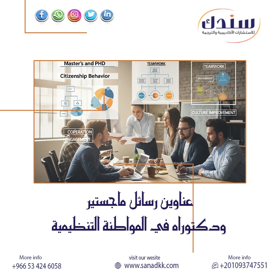 وفي ختام الحديث، تُعد المواطنة التنظيمية أساسًا لتعزيز السلوك الإيجابي والانتماء داخل بيئات العمل، وتبرز أهمية البحث العلمي عند اختيار عناوين رسائل ماجستير ودكتوراه في المواطنة التنظيمية بوصفها بداية واعية لفهم هذه الممارسات ودورها في رفع الأداء المؤسسي، فكل عنوان بحثي قوي يمهّد لمسار أكاديمي متميز، وتأتي شركة سندك شريك النجاح والتميز الأكاديمي لدعمك بخبرة احترافية، تواصل عبر تطبيق واتساب بكل سهولة للحصول على الدعم الأكاديمي وتحويل أفكارك البحثية إلى إنجاز ملموس.